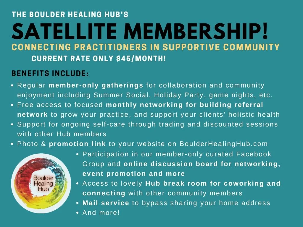 The Boulder Healing Hub’s Satellite Membership is designed to support you in your professional success and peer connection, regardless of where you practice!